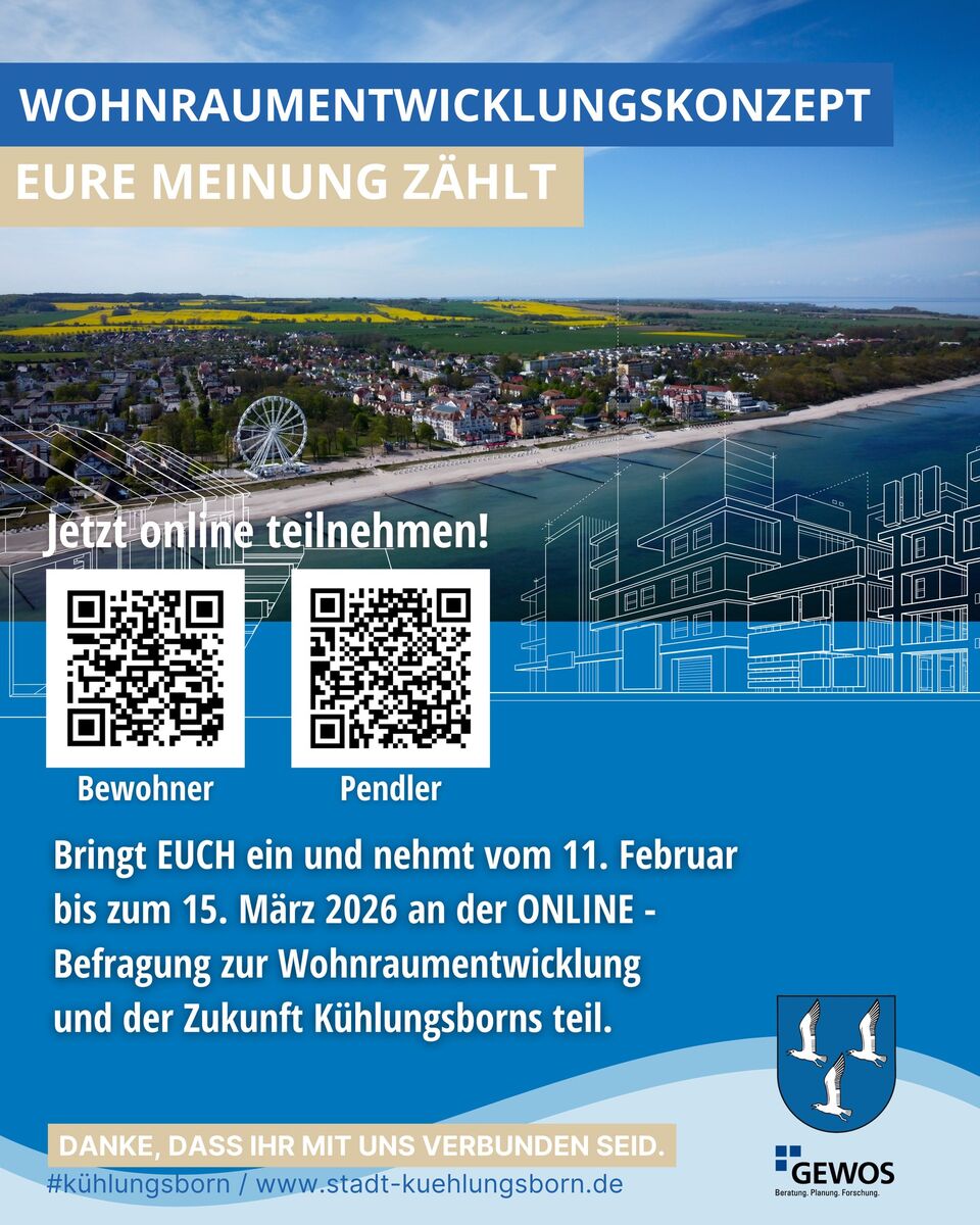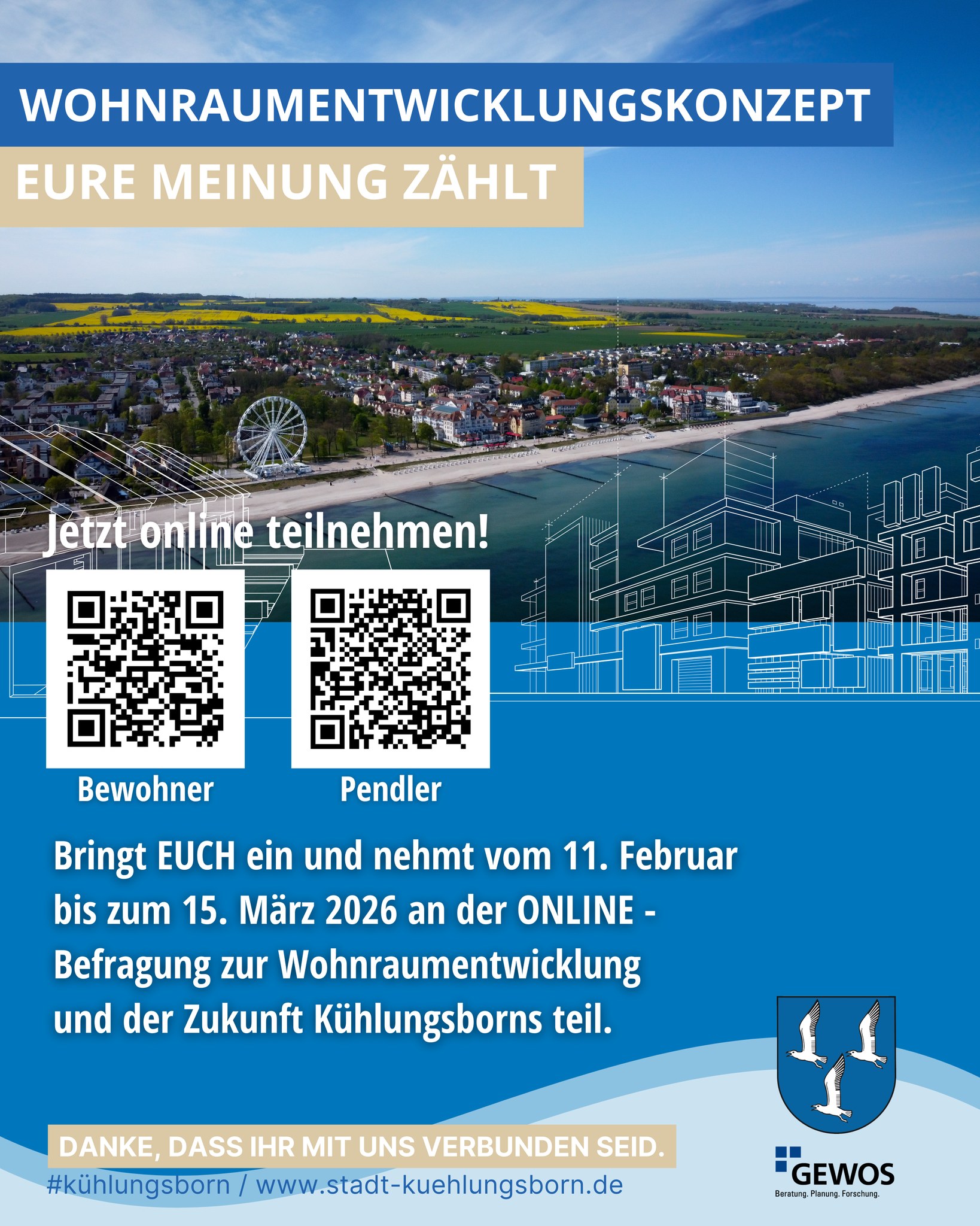 - Online: Direkt unter www.wohnraumentwicklung-kuehlungsborn.de oder www.wohnraumentwicklung-kuehlungsborn.de/pendlerbefragung